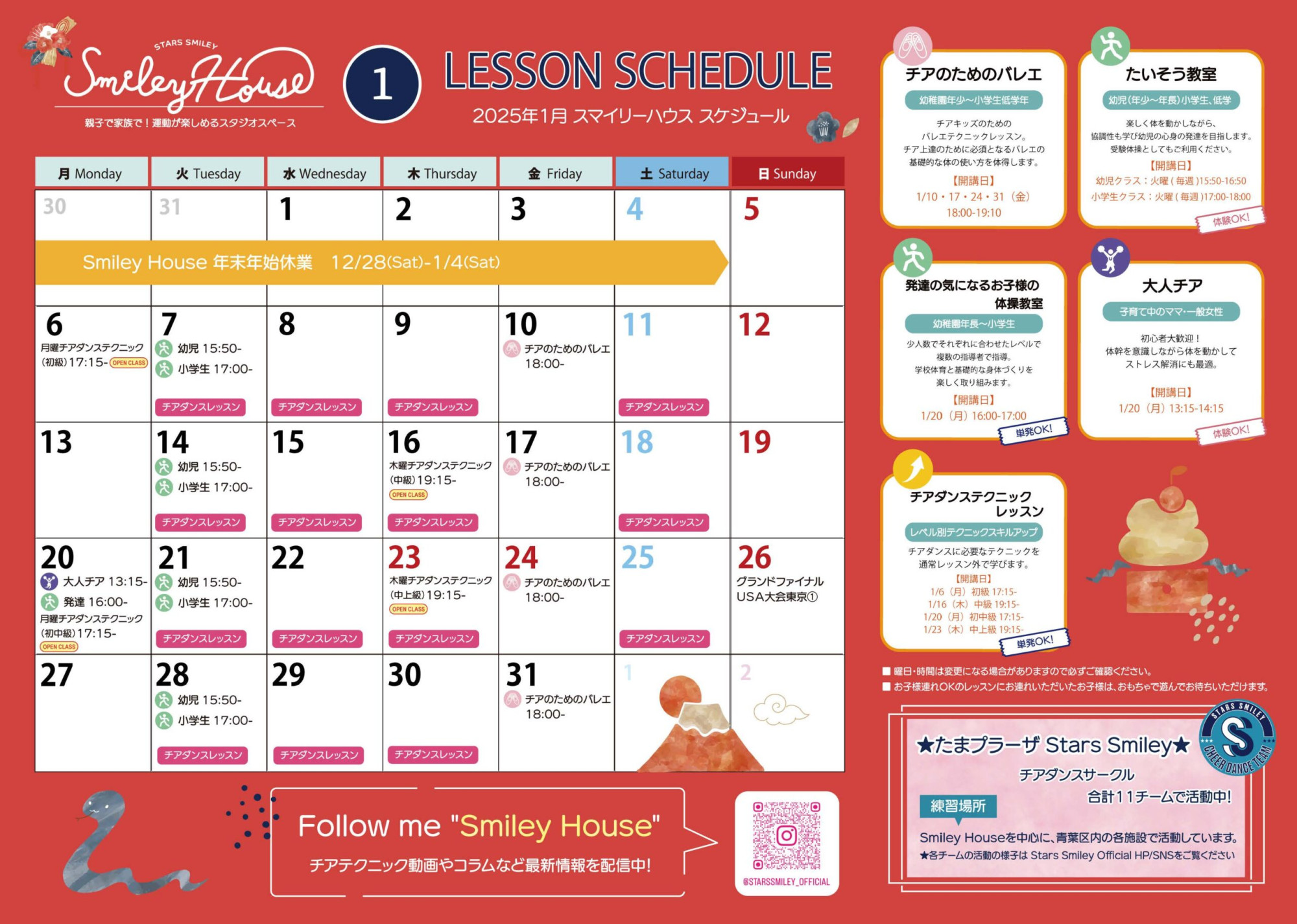 寒い日が続きますが、体調崩されていないでしょうか? 年末年始は12月28日から1月4日までは休業となります。 新年1月のSmileyは、体操教室やチアダンステクニックレッスン、発達の気になるお子さまの体操教室のご案内です。皆様のご参加をお待ちしております。♪