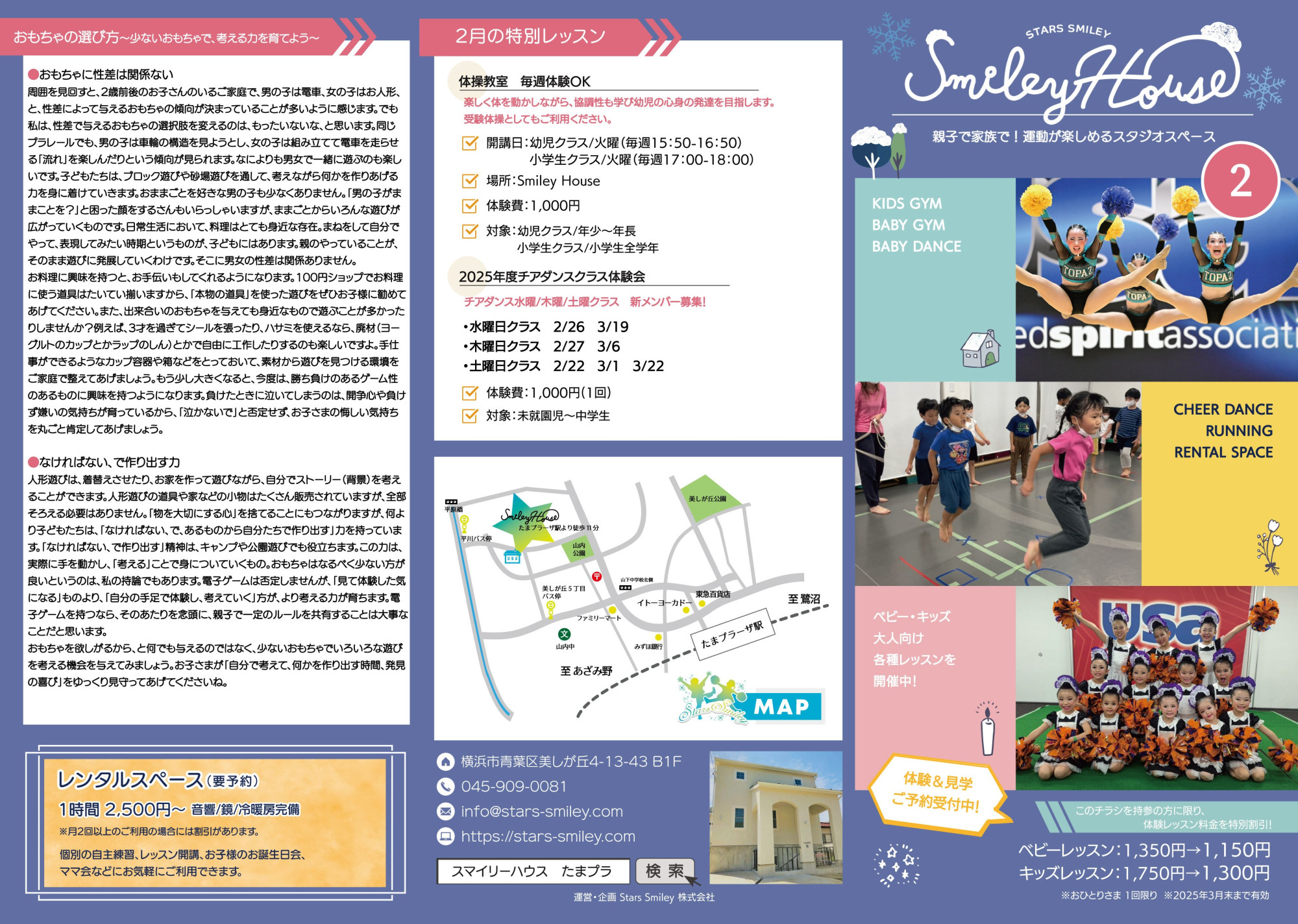2月のSmileyは、体操教室やチアダンステクニックレッスン、発達の気になるお子さまの体操教室のご案内です。皆様のご参加をお待ちしております♪
