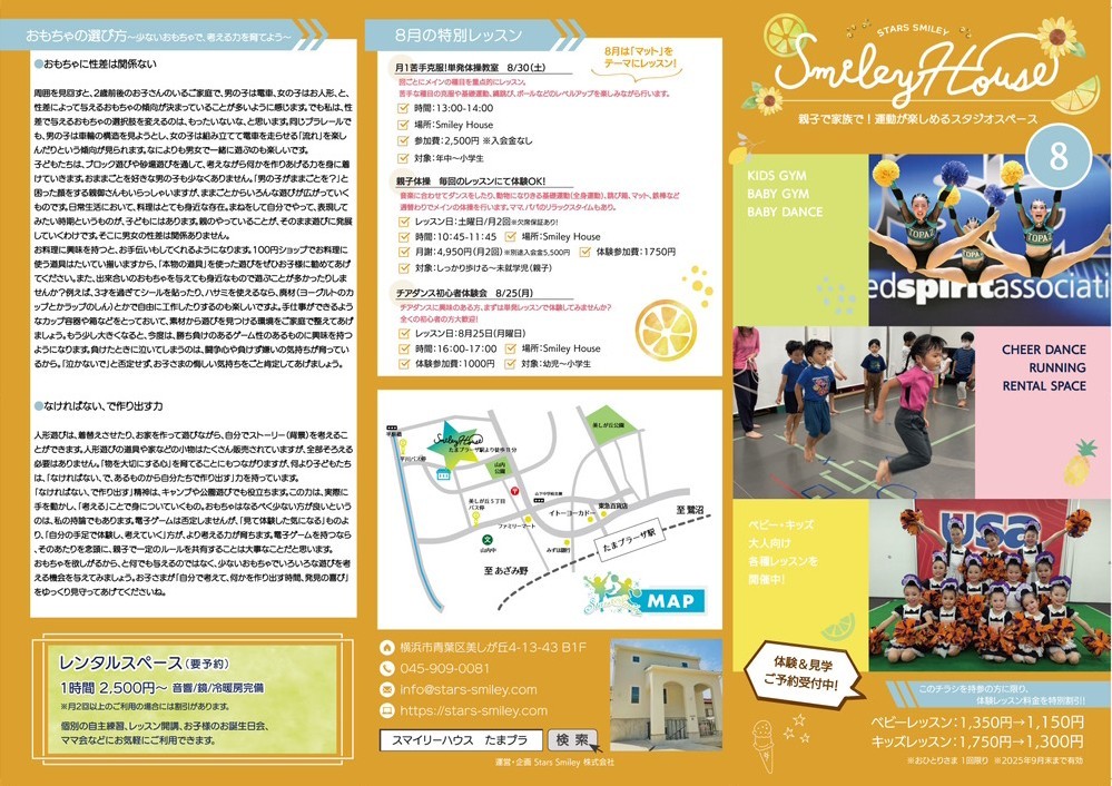 8月のSmileyは、体操教室やチアダンステクニックレッスン、チアダンス初心者体験会のご案内です。皆様のご参加をお待ちしております♪
